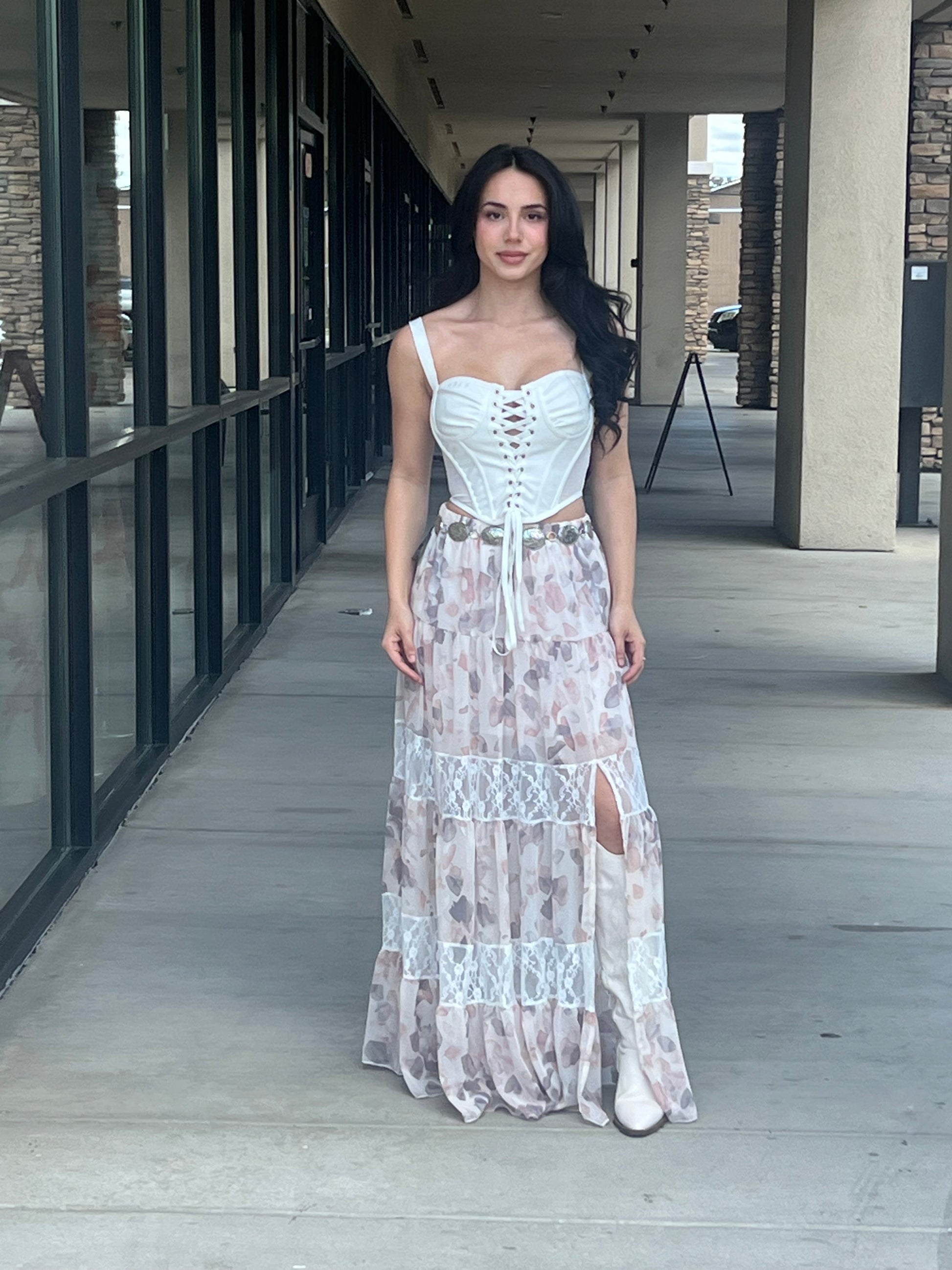 Lace Inset Tiered Maxi Skirt With Side Slit
